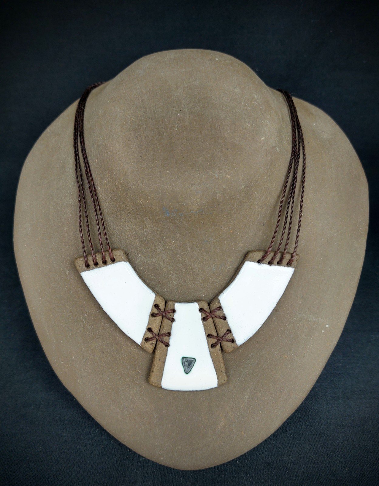colar 3 peças em argila preta com esmalte branco e detalhe em cobre fundido.